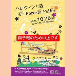 明日予定されていた『金川Foresta Felice「ハロウィンと森」』ですが、雨予報のため、ご来園いただく皆様、出展してくださる皆様の安全を考慮し、中止となりました。
