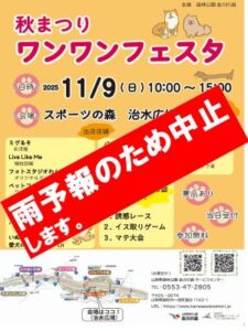 雨予報のため秋まつりワンワンフェスタは中止いたします。